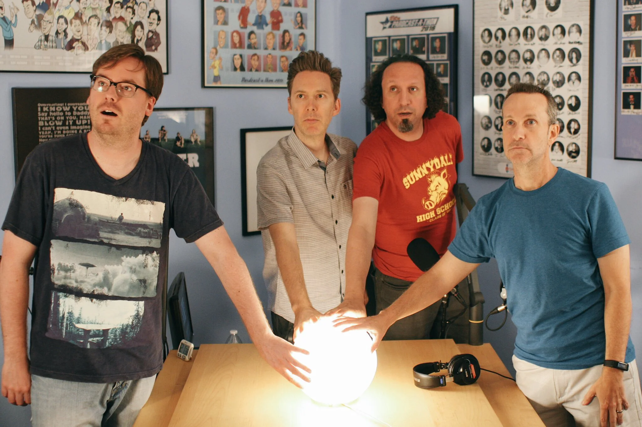 The cast of Never Not Funny. Left to right: Garon Cockrell, Matt Bellknap, Eliot Hochberg, and Jimmy Pardo.